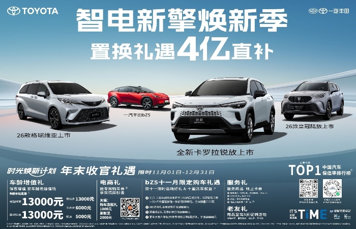 不止如此,為回饋用戶厚愛,一汽豐田年末收官禮遇再升級,以4億元廠家直補正式開啟“智電新擎煥新季”。11月1日-12月31日,皇冠陸放、格瑞維亞、普拉多等重磅車型可享至高1.3萬元的車齡增值禮;購全新bZ5更有限時購車福利贈送,此外“煥新季”還準(zhǔn)備了電商禮、老友禮、服務(wù)禮等多重大禮,以極致誠意為用戶創(chuàng)造最佳購車時機。