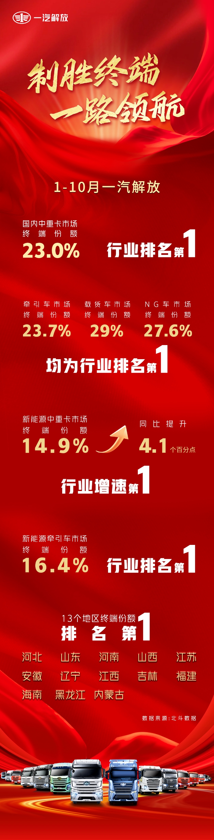 “金九銀十”戰(zhàn)鼓未息,一汽解放已捷報頻傳。10月蟬聯(lián)國內(nèi)中重卡終端銷量“第一”。商用車市場風(fēng)云變幻,誰是真正的領(lǐng)軍者?一汽解放用實力給出響亮回答。