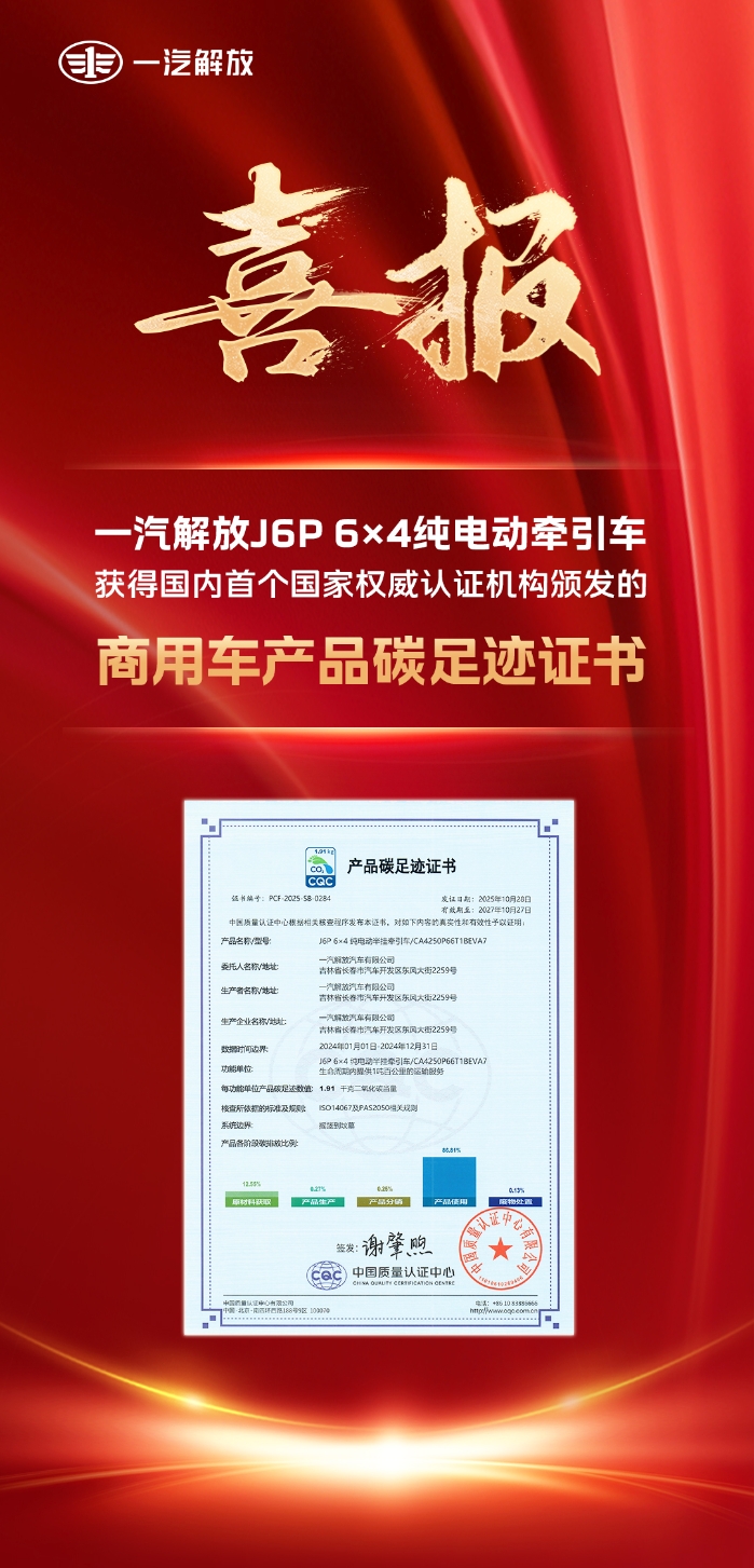 來(lái)源:解放公司本網(wǎng)訊(特約記者 黃瑋瑋)近日,解放J6P 6×4純電動(dòng)半掛牽引車(chē)CA4250P66T1BEVA7獲得中國(guó)質(zhì)量認(rèn)證中心(CQC)頒發(fā)的產(chǎn)品碳足跡證書(shū),是國(guó)內(nèi)首個(gè)經(jīng)由國(guó)家權(quán)威認(rèn)證機(jī)構(gòu)頒發(fā)的商用車(chē)產(chǎn)品碳足跡證書(shū)。證書(shū)的取得代表了解放公司產(chǎn)品碳足跡管理體系的正式建立,標(biāo)志著公司邁入全生命周期碳管理新階段,也為行業(yè)提供了產(chǎn)品碳足跡管理的參考范本。
