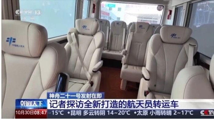 充分體現(xiàn)了航天員出征的儀式感和榮譽感。每一個座椅的頭枕上都增加了“中國載人航天”的標識,車門踏板上有同樣標識的氛圍燈。